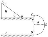 2、计算题 如图所示,倾角为α的光滑斜面与半径为R=0.4 m半圆形光滑轨道在同一竖直平面内,其中斜面与水平面BE光滑连接,水平面BE长为L=0.4 m,直径CD沿竖直方向,C、E可看做重合。现有一可视为质点的小球从斜面上距B点竖直距离为H的地方由静止释放,小球在水平面上所受阻力为其重力的。(取g=10 m/s2)求: