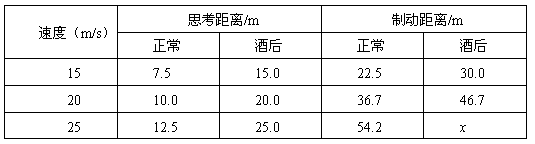 4、选择题 酒后驾驶会导致许多安全隐患,是因为驾驶员的反应时间变长,反应时间是指驾驶员从发现情况到采取制动的时间。下表中“思考距离”是指驾驶员从发现情况到采取制动的时间内汽车行驶的距离,“制动距离”是指驾驶员从发现情况到汽车停止行驶的距离(假设汽车制动时的加速度大小都相同)。分析下表可知,下列说法正确的是