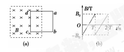 3、计算题 在如图 (a)所示的虚线框内有匀强磁场,设图示磁场方向为正,磁感应强度随时间变化规律如图(b)所示.边长为l,总电阻为R的正方形线框abcd有一半处在磁场中且固定,磁场方向垂直于线框平面,在0~T时间内,求: