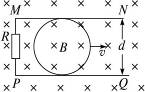 1、选择题 如右图所示,MN、PQ为平行金属导轨,M、P间连有一阻值为R的电阻,导轨处于匀强磁场中,磁感应强度为B,磁场方向与导轨所在的平面垂直,图中磁场垂直纸面向里.有一金属圆环沿两导轨滑动,速度为v,与导轨接触良好,圆环的直径为d,与两导轨间的距离相等.设金属环与导轨的电阻均可忽略,当金属环向右做匀速运动时(?)