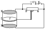 3、计算题 如图,一质量不计,可上下移动的活塞将圆筒分为上下两室,两室中分别封有理想气体。筒的侧壁为绝缘体,上底N、下底M及活塞D均为导体并按图连接,活塞面积S=2cm2。在电键K断开时,两室中气体压强均为p0=240Pa,ND间距l1=1mm,DM间距l2=3mm。将变阻器的滑片P滑到左端B,闭合电键后,活塞D与下底M分别带有等量导种电荷,并各自产生匀强电场,在电场力作用下活塞D发生移动。稳定后,ND间距l1"=3mm,DM间距l2"=1mm,活塞D所带电量的绝对值q=e0SE(式中E为D与M所带电荷产生的合场强,常量e0=8.85×10-12C2/Nm2)。求: