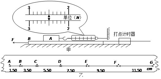 1、实验题 在一次课外活动中,某同学用图甲所示装置测量放在水平光滑桌面上铁块A与金属板B间的动摩擦因数。已知铁块A的质量mA=1kg,金属板B的质量mB=0.5kg。用水平力F向左拉金属板B,使其向左运动,弹簧秤的示数如图甲所示,则A、B间的摩擦力Fμ=? __?N,A、B间的动摩擦因数μ=?。(g取10m/s2)。该同学还将纸带连接在金属板B的后面,通过打点计时器连续打下一系列的点,测量结果如图乙所示,图中各计数点间的时间间隔为0.1s,可求得拉金属板的水平力F=?N?。