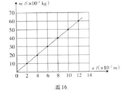 本题解析::由表中记录的数据可知,实验所用刻度尺最小刻度为1mm,记录数据应该估读到0.1mm,所以L3数值记录不规范。由于纵轴是砝码的质量,横轴应是弹簧长度与弹簧下端挂上砝码盘时长度Lx的差值。由mg=kx可知,图象斜率等于弹簧的劲度系数为4.9N/m;通过图和表可知砝码盘的质量为10g。