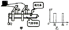 4、简答题 某研究性学习小组利用气垫导轨验证机械守恒定律,实验装置如图甲所示,在气垫导轨上相隔一定距离的两处安装两个光电传感器A、B,滑块P上固定一遮光条,若光线被遮光条遮挡,光电传感器会输出高电压,两光电传感器采集数据后与计算机相连.滑块在细线的牵引下向左加速运动,遮光条经过光电传感器A、B时,通过计算机可以得到如图乙所示的电压U随时间t变化的图象.