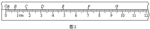 (2)电火花计时器接在频率为50Hz的交流电源上,图2为实验中打出的一条纸带,从起始点O开始,将此后连续打出的7个点依次标为A、B、C、D……,电火花计时器打F点时,重锤下落的速度为____________m/s。(保留到小数点后两位)