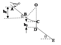 4、计算题 山地滑雪是人们喜爱的一项体育运动。一雪坡由AB和BC两段组成,AB是倾角为θ=370的斜坡,可认为光滑。BC是半径为R=5m的圆弧面,有摩擦。圆弧面BC与斜坡AB相切于B点,与水平面相切于C点,如图所示。又已知AB竖直高度h1= 9.8m,竖直台阶CD高度为h2=5m,台阶底端D与倾角为θ=370的斜坡DE相连。运动员连同滑雪装备总质量为80kg,从A点由静止滑下通过C点后飞落到DE上,其中运动员在BC圆弧面上运动时由于受到摩擦力的作用速度的大小保持不变。整个运动过程中不计空气阻力,g取10m/s2,sin370=0.6,cos370=0.8。求: