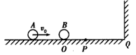 3、计算题 在光滑的水平面上,质量为m1的小球A以速率v0向右运动,在小球A的前方O点有一质量为m2的小球B处于静止状态,如图所示。小球A与小球B发生正碰后小球A、B均向右运动。小球B被在Q点处的墙壁弹回后与小球A在P点相遇,PQ=1.5PO。假设小球间的碰撞及小球与墙壁之间的碰撞都是弹性的,求两小球质量之比m1/m2。