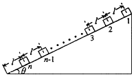 4、计算题 如图,倾角为θ的斜面固定。有n个质量都为m的相同的小木块(可视为质点)放置在斜面上。相邻两小木块间距离都为l,最下端的木块距底端也是l,小木块与斜面间的动摩擦因数都为μ。在开始时刻,第一个小木块从斜面顶端以初速度v0沿斜面下滑,其余所有木块都静止,由于第一个木块的下滑将依次引起一系列的碰撞。设每次碰撞的时间极短,在每次碰撞后,发生碰撞的木块都粘在一起运动,直到最后第n个木块到达底端时,速度刚好为零。己知重力加速度为g。求:
