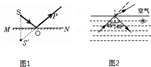 因为入射光线在水中,所以折射光线在空气中,并且折射角大于入射角.画出光路图如图2所示.