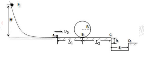 (3)若小滑块是与从光滑斜轨道E点静止释放的小球发生完全非弹性碰撞后,离开A点的(小球质量与小滑块的质量相等,且均可视为质点,斜轨道与水平地面平滑连接),求当满足(2)中游戏规则时,释放点E与过A水平面的竖直高度H的大小范围。