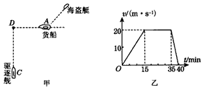 某日清晨,海面上有薄雾,一艘某国的货轮正在匀速行驶,到达A处时,船长突然发现后侧面不远处有海盗的快艇正在向他们靠近,并预计还有40 min就会追上货船,于是立即向在C处海域执行任务的我国某驱逐舰发出求援信号,我官兵立即推算出40 min后的货船位置应在D处,马上调好航向,沿CD直线方向从静止出发恰好在40 min内到达D处,如图甲所示,驱逐舰运动的速度、时间图象如图乙所示,求: