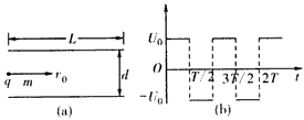 4、选择题 如图(a)所示,A、B表示真空中水平放置的相距为d的平行金属板,板长为L,两板加电压后板间的电场可视为匀强电场,现在A、B两板间加上如图(b)所示的周期性的交变电压,在t=0时恰有一质量为m、电量为q的粒子在板间中央沿水平方向以速度v0射入电场,忽略粒子的重力,则下列关于粒子运动状况的表述中正确的是
