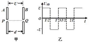 2、计算题 如图甲所示,A、B是一对平行放置的金属板,中心各有一个小孔P、Q,P、Q 连线垂直金属板,两极板间距离为d,从P点处连续不断地有质量为m,带电量为m的带正电粒子沿P、Q方向放出,带电粒子的初速度和重力均忽略不计.从t = 0开始,在A、B间加上如图乙所示的交变电压,周期为T,电压为U.带电粒子在A、B间运动过程中,粒子间的相互作用力忽略不计.