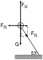 3、计算题 如图所示,轻绳的一端系在地上,另一端系着氢气球,氢气球重20 N,空气对它的浮力恒为30 N,由于受恒定水平风力作用,使系氢气球的轻绳和地面成53°角,(g取10m/s2)则:
