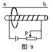 3、选择题 如图所示,光滑杆ab上套有一闭合金属环,环中有一个通电螺线管。现让滑动变阻器的滑片P迅速滑动,则(?)
