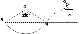 2、计算题 如图所示,质量为m=50kg的滑雪运动员(可视作质点),在平台上滑行一段距离后水平滑出,从空中运动一段时间后,从A点恰好沿圆弧切线的方向进入半径为R=5.0m的竖直圆弧轨道中。然后在摩擦阻力的作用下沿竖直圆弧轨道作匀速圆周运动。已知A、B为圆弧两端点,其连线水平,对应圆心角为θ=1200,平台与AB连线的高度差为h=1.35m.(忽略空气阻力g=10m/s2)求: