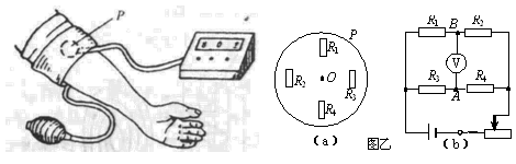 5、实验题 如图甲(a)所示为测量血压的压力传感器在工作时的示意图,薄金属片P固定有4个电阻R1、R2、R3、R4,右边如图甲(b)是它的侧面图,这4个电阻如图乙(a)连接成电路如图乙(b)所示,试回答: