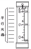 3、选择题 有一个不断均匀滴水的龙头(刚滴出的水滴速度为零)在平行光源的照射下,可以观察到一种奇特的现象:只要耐心地缓慢调节水滴下落的时间间隔,在适当的情况下,看到的水滴好象都静止在各自固定的位置不动(如图中A、B、C、D所示,右边数值的单位是cm).要出现这一现象,取g=10m/s2,所用光源应满足的条件是( )