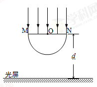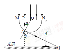 4、计算题 (9分)如图所示,一半径为R的半球形玻璃砖,O为球心, 其上表面水平, 玻璃砖下方水平放置了足够大的光屏,玻璃砖上表面与光屏间距为d =