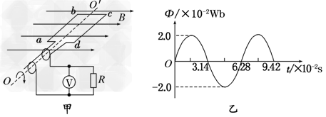 2、计算题 如图甲为小型旋转电枢式交流发电机的原理图。其矩形线圈在匀强磁场中绕垂直于磁场方向的固定轴OO′匀速转动,线圈的匝数n=100、电阻r=10Ω。线圈两端的电流环与电阻R连接,电阻R=90Ω,与R并联的电压表为理想电压表。在t=0时刻,线圈平面与磁场方向平行,穿过每匝线圈的磁通量随时间t按图乙所示正弦规律变化。求: