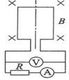 4、计算题 有n=10匝的矩形线圈,每匝都是长50cm,宽20cm,线圈总电阻10Ω,在B=2T的匀强磁场中以角速度ω=50rad/s旋转.线圈与R=40Ω的外电阻连接,图中的电流表、电压表的接入不影响原电路.求: