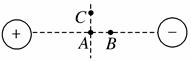 5、选择题 如图所示,在等量异种点电荷形成的电场中有A、B、C三点,A点为两点电荷连线的中点,B点为连线上距A点距离为d的一点,C点为连线中垂线上距A点距离也为d的一点,则下面关于三点电场强度E的大小、电势