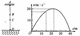 1、简答题 一质量为50 kg的男孩在距离河流40 m高的桥上做"蹦极跳",未拉伸前长度AB为15 m的弹性绳一端缚着他的双脚.另一端则固定在桥上的A点,如图所示,然后男孩从桥面下坠直至贴近水面的最低点D,假定绳在整个运动过程中遵守胡克定律,不考虑空气阻力、男孩的大小和绳的质量忽略不计(g取10 m/s2),且男孩的速率v跟下坠的距离s的变化如图所示.男孩在C点时的速率最大.
