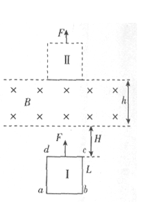 2、计算题 (10分)如图所示,在高度差h="0.5" m的平行虚线范围内,有磁感强度B="0.5" T、方向垂直于竖直平面向里的匀强磁场,正方形线框abcd的质量m="0.1" kg、边长L="0.5" m、电阻R=0.5