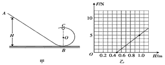 1、计算题 在半径R=5000km的某星球表面,宇航员做了如下实验。实验装置如图甲所示,竖直平面内的光滑轨道由轨道AB和圆弧轨道BC组成,将质量m=0.2kg的小球从轨道AB上高H处的某点静止滑下,用力传感器测出小球经过C点时对轨道的压力F,改变H的大小,可测出相应的F大小,F随H的变化关系如图乙所示。求: