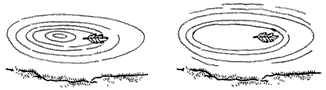 4、填空题  下图为水波传播的先后两个时刻的情景,试比较两图中水波的传播情况与水面上树叶的位置,可以得出的结论是:____________。