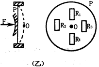 (2)当O点加一个压力F后,AB间存在电势差,p在形变时,R1R4变长,阻值变大,R2R3变宽,阻值变小。
