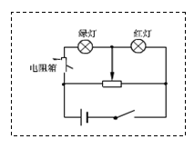 本题解析:电路如图所示,当滑片滑到左端时,绿灯被短路,当滑片滑到右端时,绿灯正常发光,红灯被短路,此时绿灯电阻为4Ω,电压为4V,则电阻箱电压为2V,电阻为2Ω.