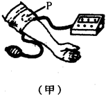 2、实验题 如图(甲)所示是一种测量血压的压力传感器在工作时的示意图.薄金属片P固定有4个电阻R1、R2、R3、R4[如图(乙)所示,4个电阻的形状会跟着薄金属片受压而变化,左边是它的侧面图],这4个电阻连接成电路如图(丙)所示,它为什么能测量血压?其工作原理是:当O点加一个压力F后薄金属片P发生形变,这时4个电阻也随之发生形变,形变能使各电阻大小发生变化,使A点与B点之间产生电势差。血压越高,压力越大,金属片形变越显著,电阻变化越大,因此电压表的示数越大,于是就可根据电压表的示数大小测量血压的高低了。请分析各图并回答下列问题: