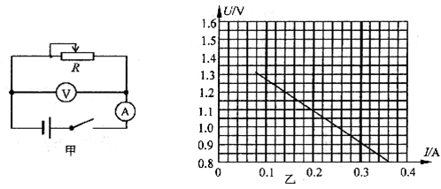 本题解析:① 根据闭合电路的欧姆定律得:U=-Ir+E,将图像延长与纵坐标相交其交点等于电动势,如图所示,E=1.45V;图像的斜率表示内阻求得r="1.80Ω" ②根据原理知,甲图的测量误差为电压的测量由误差,电流表的分压引起的,故电动势的测量值等于真实值,内阻的测量值大于真实值