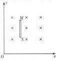 3、计算题 如图所示,在x≥0的区域内存在与xOy平面垂直的匀强磁场,磁感应强度的大小为B,方向垂直于纸面向里。假设一束初速度为零的质量为m、带电荷量为q的正离子,经过加速电场加速后从O点沿x轴正方向进入匀强磁场区域。有一块厚度不计、高度为d的金属板竖直放置在磁场中,截面如图,M、N分别为金属板截面的上、下端点,M点的坐标为(d,2d),N点的坐标为(d,d)。正离子的重力不计。
