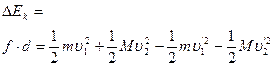说明:上式表示系统动能损失的数值为,而为系统在相互作用前的初动能,为系统在相互作用后的末初动能,故系统动能的损失等于运动阻力与子弹相对木块的位移 d 的乘积,损失的动能转化成系统的内能。此结论可归纳为: 滑动摩擦力和力对应的物体间相对位移的乘积数值上等于系统机械能的损失,,这结论广泛应用于类似的动能变化关系的问题之中
