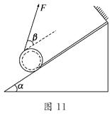 4、计算题 (15分)在倾角α=37°的斜面上,一条质量不计的皮带一端固定在斜面上端,另一端绕过一质量m=3 kg、中间有一圈凹槽的圆柱体,并用与斜面夹角β=37°的力F拉住,使整个装置处于静止状态,如图11所示.不计一切摩擦,求拉力F和斜面对圆柱体的弹力FN的大小.(g=10 m/s2,sin37°=0.6,cos37°=0.8)