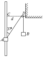 5、计算题 如图所示,光滑固定的竖直杆上套有一个质量m=0.4kg的小物块A,不可伸长的轻质细绳通过固定在墙壁上、大小可忽略的定滑轮D,连接物块A和小物块B,虚线CD水平,间距d=1.2m,此时连接物块A的细绳与竖直杆的夹角为37°,物块A恰能保持静止。现在物块B的下端挂一个小物块Q,物块A可从图示位置上升并恰好能到达C处。不计摩擦和空气阻力,、