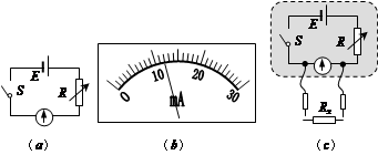(2)同学乙将甲设计的电路稍作改变,在电流计两端接上两个表笔,如图(c)所示,设计出一个简易的欧姆表,并将表盘的电流刻度转换为电阻刻度:闭合开关,将两表笔断开,调节电阻箱,使指针指在“30mA”处,此处刻度应标阻值为?Ω(填“0”或“∞”);再保持电阻箱阻值不变,在两表笔间接不同阻值的已知电阻找出对应的电流刻度。则“10mA”处对应表笔间电阻阻值为?Ω。