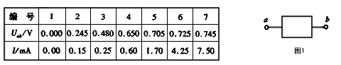 4、实验题 某同学对黑箱(见图1)中一个电学元件的伏安特性进行研究。通过正确测量,他发现该元件两端的电压Uab(Uab=Ua-Ub)与流过它的电流I之间的变化关系有如下规律:①当-15V<Uab<0V时,I近为零;②当Uab≥0时,Uab和I的实验数据见下表: