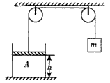 4、计算题 如图所示,圆柱形气缸A中用质量为2m的活塞封闭有一定质量的理想气体,温度为27℃,气缸中的活塞通过滑轮系统悬挂一质量为m的重物,稳定时活塞与气缸底部距离为h。现在重物m上加挂质量为的小物体,已知大气压强为p0,