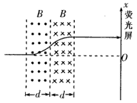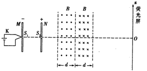 4、计算题 如图所示,M、N为两块带等量异种电荷的平行金属板,S1、S2为板上正对的小孔,N板右侧有两个宽度均为d的匀强磁场区域,磁感应强度大小均为B,方向分别垂直于纸面向外和向里,磁场区域右侧有一个荧光屏,取屏上与S1、S2共线的O点为原点,向上为正方向建立x轴。M板左侧电子枪发射出的热电子经小孔S1进入两板间,电子的质量为m,电荷量为e,初速度可以忽略。
