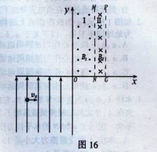 水平向右射出,经过原点O处射入区域I后垂直MN射入区域Ⅱ,(粒子的重力忽略不计)求: