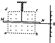 3、简答题 某同学自制一电流表,其原理如图所示,质量为m的均匀细金属杆MN与一竖直悬挂的绝缘轻弹簧相连,弹簧的劲度系数为k,在矩形区域abcd内有匀强磁场,磁感应强度大小为B,方向垂直纸面向外,磁场边界ab的长度为L1,bc的长度为L2,MN的长度大于ab,当MN中没有电流通过且处于静止时,MN与矩形区域的ad、bc中点连线重合,且指针指在标尺的零刻度,当MN中有电流时,指针示数可表示电流强度.MN始终在纸面内且保持水平,重力加速度为g.