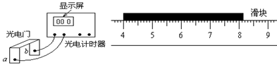 3、填空题 光电计时器是一种常用计时仪器,其结构如图所示,a、b分别是光电门的激光发射和接收装置,当有滑块从a、b间通过时,光电计时器就可以显示物体的挡光时间.现有某滑块通过光电门,计时器显示的挡光时间是5×10s,用最小分度值为l mm的直尺测量小滑块的长度d,示数如图所示。