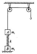 1、计算题 如图所示,质量为m1的物体A经一轻质弹簧与下方地面上的质量为m2的物体B相连,弹簧的劲度系数为k,A、B都处于静止状态。一条不可伸长的轻绳绕过轻滑轮,一端连物体A,另一端连一轻挂钩。开始时各段绳都处于伸直状态,A上方的一段绳沿竖直方向。现在挂钩上挂一 质量为m3的物体C并从静止状态释放,它恰好能使B离开地面但不继续上升。已知重力加速度为g,求: