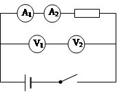 1、选择题 四个相同的电流表分别改装成两个电流表A1、A2和两个电压表V1、V2,A1的量程大于的量程A2的量程, V1的量程大于V2的量程,把它们接入如图所示的电路,闭合开关后 (? )
