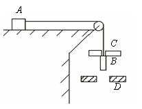 4、计算题 如图所示,物体A、B用细线连接绕过定滑轮,物体C中央有开口,C放在B上。固定挡板D中央有孔,物体B可以穿过它而物体C又恰好能被挡住。物体A、B、C的质量MA=0.80kg、MB=MC=0.10kg,物体B、C一起从静止开始下降H1=0.50m后,C被固定挡板D截住,B继续下降H2=0.30m后停止。求:物体A与平面的动摩擦因数μ(g=10m/s2)