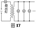 4、计算题 如图17所示,交流发电机电动势的有效值E=30 V,内阻不计,它通过一个R=6 Ω的指示灯连接降压变压器.变压器输出端并联96只彩色小灯泡,每只灯泡都是“6 V,0.25 W”,灯泡都正常发光,导线电阻不计.求: