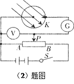 (2)①当变阻器的划片向右端滑动时通过电流表的电流减小,②当电流表减小到零时,没有电子跑到阳极,最大初动能为到达阳极刚好速度减小到零,所以为Ue.③不变光子的能量和入射光的频率有关,